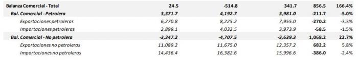Hasta noviembre del 2019 el país logró revertir el déficit que tenía su balanza comercial. De enero a hasta ese mes sumó un saldo a favor de $ 341,7 millones, debido a la recuperación de las exportaciones no petroleras y la debilidad en las compras que se hicieron al extranjero.
