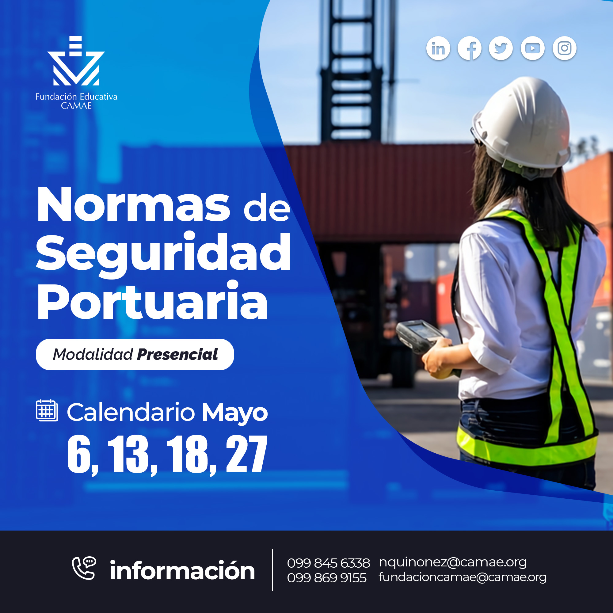 Normas de Seguridad PortuariaMay182022 Cuándo: miércoles 18 de mayo, 2022 a las 16:00 👉Para más información déjanos un mensaje y nos ponemos en contacto✍️WhatsApp: 099 869 9155 – 099 845 6338Correo: fundacioncamae@camae.org – nquinonez@camae.org Compartir