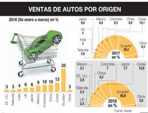 Antes del acuerdo comercial, este segmento ocupaba el 2,4 % del total del mercado (ver gráfico). En el primer trimestre de este año, este grupo de vehículos llega al 6 %, según estadísticas de la Asociación de Empresas Automotrices del Ecuador (Aeade).