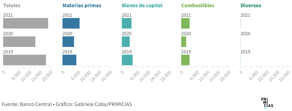 Las importaciones de materias primas suman USD 6.500 millones entre enero y septiembre de 2021. Eso es igual a un crecimiento de 47,7% frente al mismo período de 2020 y de 23,1% en comparación con los nueve primeros meses de 2019. Las importaciones de bienes diversos, como artesanías, también registran un crecimiento en valor, de 9,7%, en comparación con enero-septiembre de 2019.