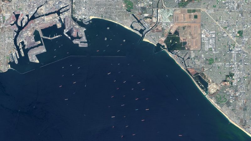 Las imágenes satelitales sobre los puertos de Long Beach y Los Ángeles muestran un enjambre de barcos inactivos, esperando descargar la mercadería.
