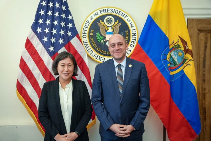 El ministro de Producción, Comercio Exterior, Inversiones y Pesca de Ecuador, Julio José Prado, sostuvo una reunión con la representante comercial de Estados Unidos, Katherine Tai, con el objetivo de fortalecer y profundizar la relación económica y comercial entre ambas naciones. Así lo indica un comunicado del MPCEIP.