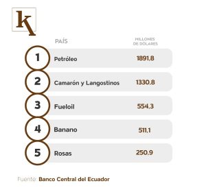 Cabe mencionar que en este paìs se envìa principalmente el petróleo, en cerca de USD 1892 millones, como principal producto de exportación y que tiene un peso del 30% en el total exportado a este destino. Asimismo, otro producto de alta relevancia en Estados Unidos son los camarones y langostinos, que alcanzaron un valor exportado de USD 1331 millones, posicionándose como el principal producto no petrolero.