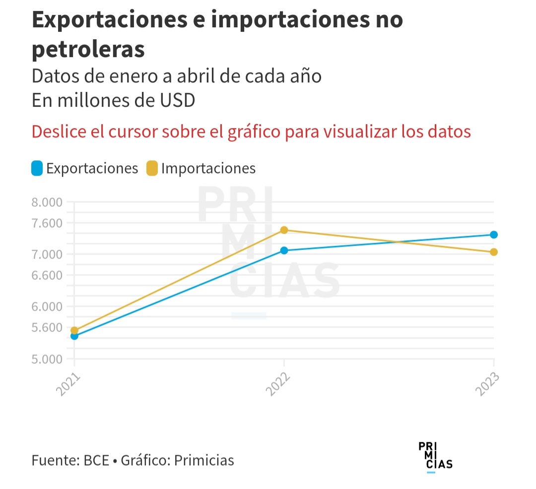 En los primeros cuatro meses del año, el valor de las exportaciones no petroleras fue de USD 7.370 millones, mientras que el de las importaciones no petroleras fue de USD 7.039.