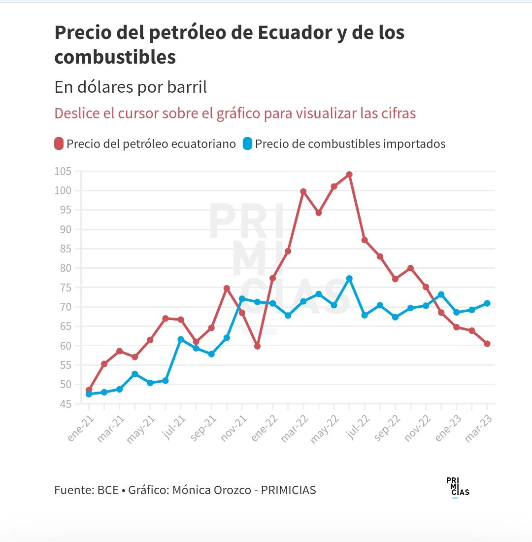 En ese contexto, el precio de importación de los combustibles para Ecuador fue de USD 69,64 por barril en el primer trimestre, es decir, USD 6 más que el precio de exportación del barril de petróleo ecuatoriano.