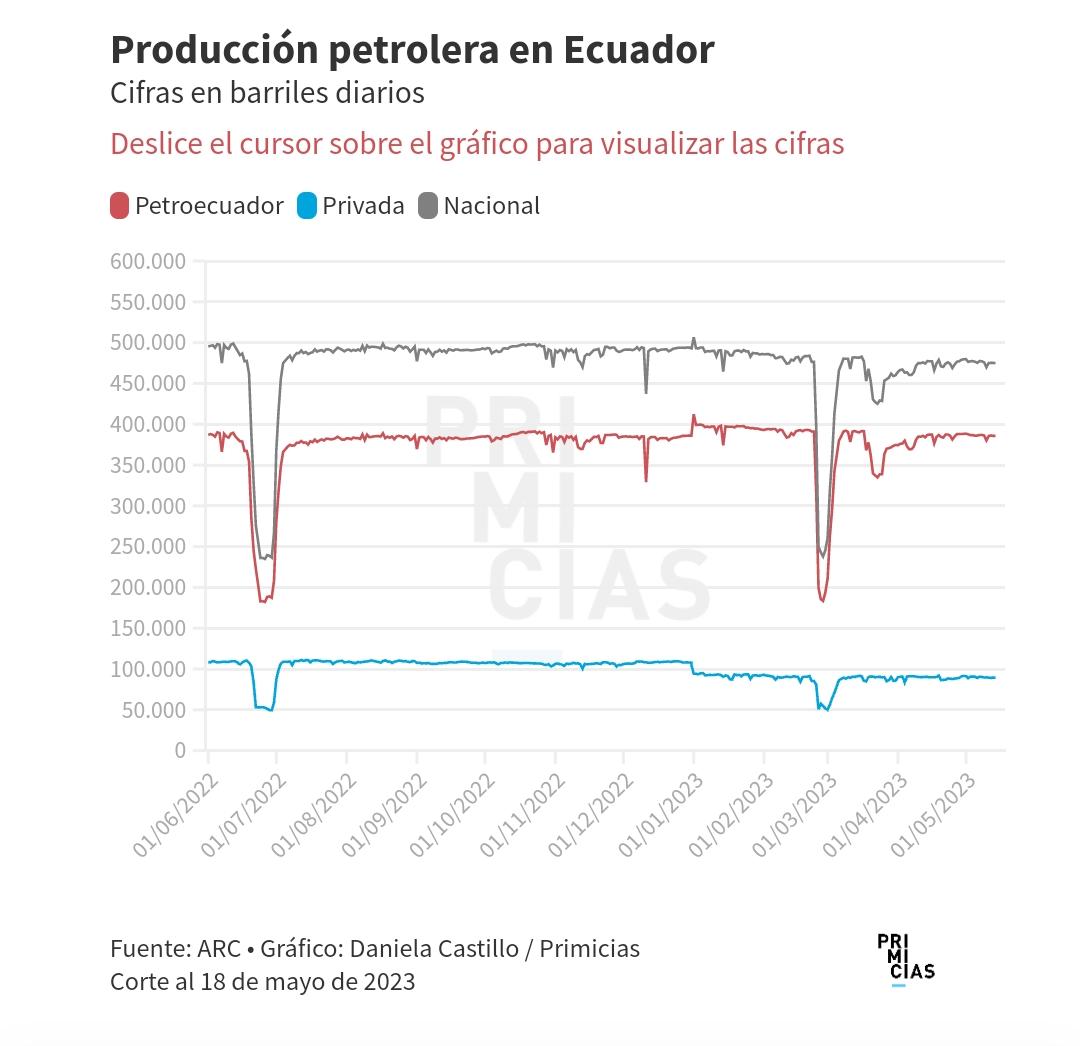 La producción petrolera de Ecuador está a la baja. En lo que va de 2023, se ubicó en 464.089 barriles diarios, el 70% de esa producción fue de la petrolera estatal Petroecuador. Se trata de la cifra más baja desde 2003.