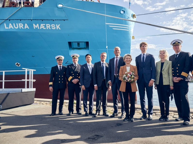 El primer portacontenedores del mundo propulsado por metanol llevará el nombre “Laura Mærsk”, reveló la presidenta de la Comisión Europea Ursula von der Leyen, en una ceremonia en el puerto de Copenhague este jueves 14 de septiembre. Durante la ceremonia la madrina del buque, la presidenta von der Leyen, bautizó la nave rompiendo una botella de champán en la proa. Además de la madrina, en la ceremonia también intervinieron el presidente de Maersk, Robert Uggla, y el CEO de Maersk, Vincent Clerc.