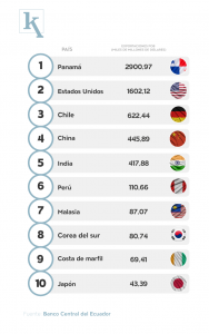 Según el Banco Central del Ecuador (BCE), el petróleo es el principal producto de exportación ecuatoriano con un aporte al ingreso de divisas hacia el país de USD 6.400 miles de millones. El principal destino o país al que más se exporta este producto corresponde a Panamá, en el cual se negocian exportaciones por USD 2.901 miles de millones.