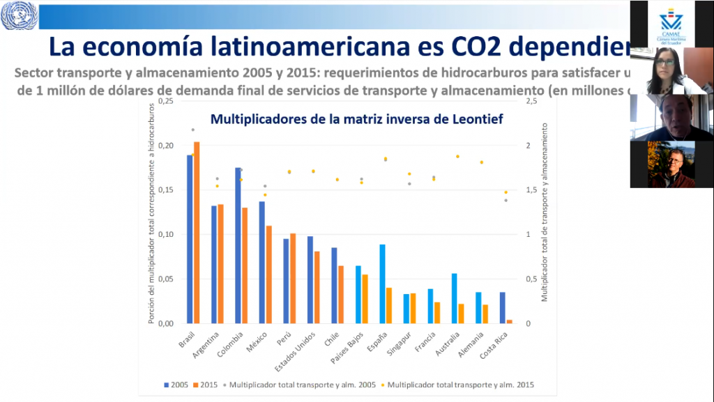 Mostró una estudio de 8 países en la región: Argentina, Chile, Brasil, Colombia, Ecuador, México, Perú y Uruguay, cuyo resultado indica que en el caso de las exportaciones, alrededor de 24 millones de toneladas de equivalente al CO2, representa aproximadamente el 2.8% de los 870 millones de toneladas emitidas por el transporte marítimo internacional durante un año.