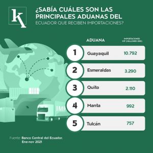 Según datos del Banco Central del Ecuador, el principal punto de ingreso de importaciones al país corresponde a Guayaquil, esta aduana recibió el 59% del total de importaciones que recibió el país en el transcurso del 2021, alcanzando un valor de USD 10.792 millones, de los cuales 93,5% llegaron de forma marítima.