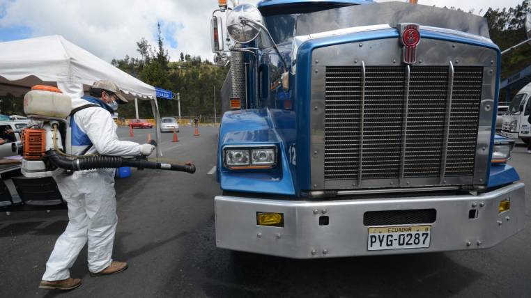 Un tráiler, que viene de Ipiales, se divisa desde el paso fronterizo. Va a cruzar el puente internacional de Rumichaca (Carchi) que une a Ecuador y Colombia. Entonces, una funcionaria de Agrocalidad hace señas para que se detenga. El vehículo avanza por el carril izquierdo y allí, frente a una carpa blanca, para la marcha. Otro funcionario, este vestido con un traje especial de color blanco para la desinfección, se coloca la bomba de fumigación sobre su espalda. Anota los datos en una hoja de registro: producto: papel; procedencia: Cali. Y enseguida empieza a rociar un líquido, amonio cuaternario al 20 %, en las llantas. Las cubre por completo. El objetivo: eliminar cualquier rastro del hongo Fusarium Raza 4 que podría llegar desde el vecino país.