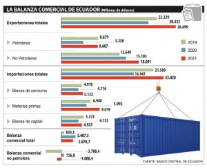 Referente a la balanza comercial no petrolera, esta es negativa (-1.080 millones de dólares), porque se importaron más materias primas (50 %) y bienes capitales (18,6 %); pero esto fue utilizado por las empresas para producir, dijo Calderón. Subrayó que es importante fortalecer más las exportaciones no petroleras, porque llegará el día en que se utilicen más carros eléctricos que los que usan petróleo. Entonces está bien que el país se enfoque en vender más al mundo sus productos no petroleros, dijo.