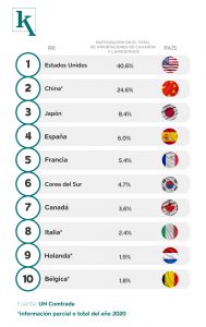 Cabe mencionar que el mayor importador a nivel mundial es Estados Unidos con el 41% del total en 2021, seguido de China que representó el 25%.