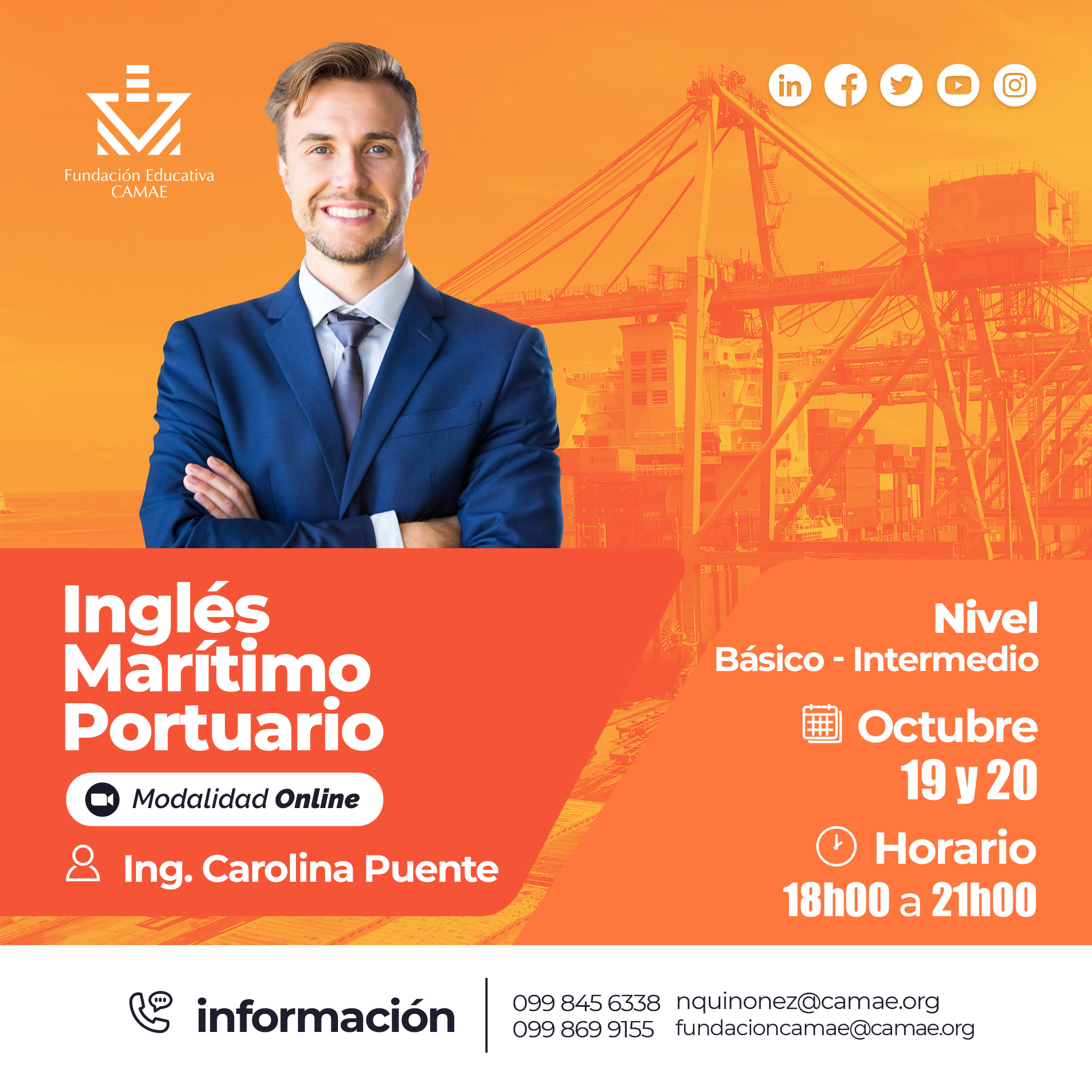 Inglés Marítimo PortuarioOct192022 Cuándo: miércoles 19 de octubre, 2022 a las 18:00 👉Para más información déjanos un mensaje y nos ponemos en contacto✍️WhatsApp: 099 869 9155 – 099 845 6338📧 Correo: fundacioncamae@camae.org – nquinonez@camae.org Compartir