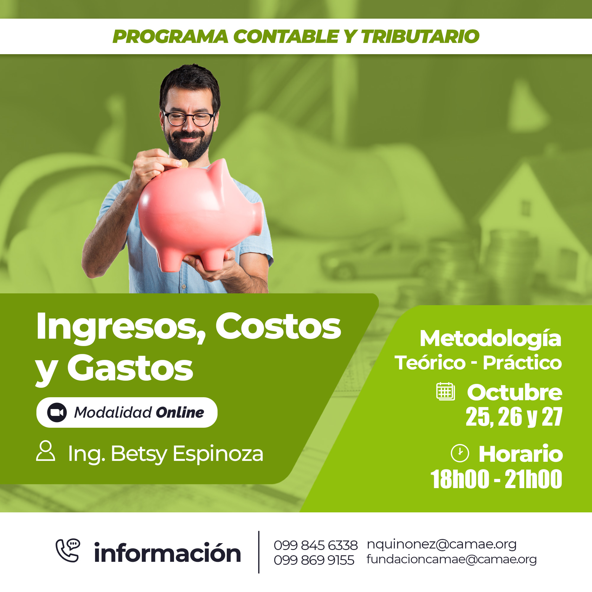 Ingresos, Costos y GastosOct252022 Cuándo: martes 25 de octubre, 2022 a las 18:00 👉Para más información déjanos un mensaje y nos ponemos en contacto✍️WhatsApp: 099 869 9155 – 099 845 6338📧 Correo: fundacioncamae@camae.org – nquinonez@camae.org Compartir