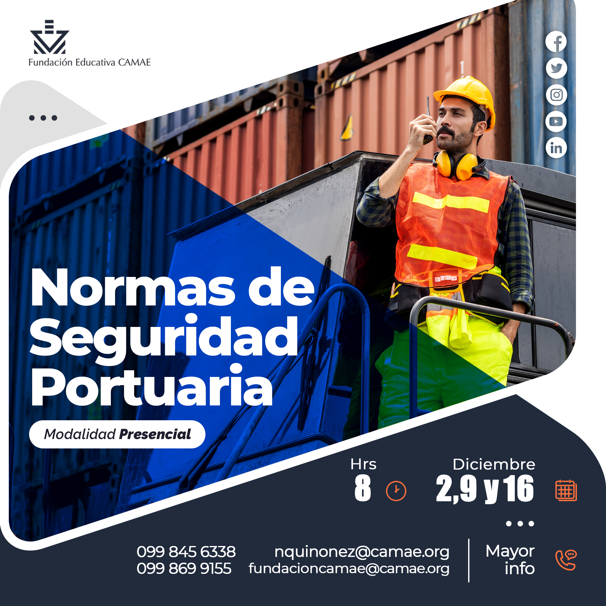 Normas de Seguridad Portuaria PresencialDic162022 Cuándo: viernes 16 de diciembre, 2022 a las 10:05 👉Para más información déjanos un mensaje y nos ponemos en contacto✍️WhatsApp: 099 869 9155 – 099 845 6338📧 Correo: fundacioncamae@camae.org – nquinonez@camae.org Compartir