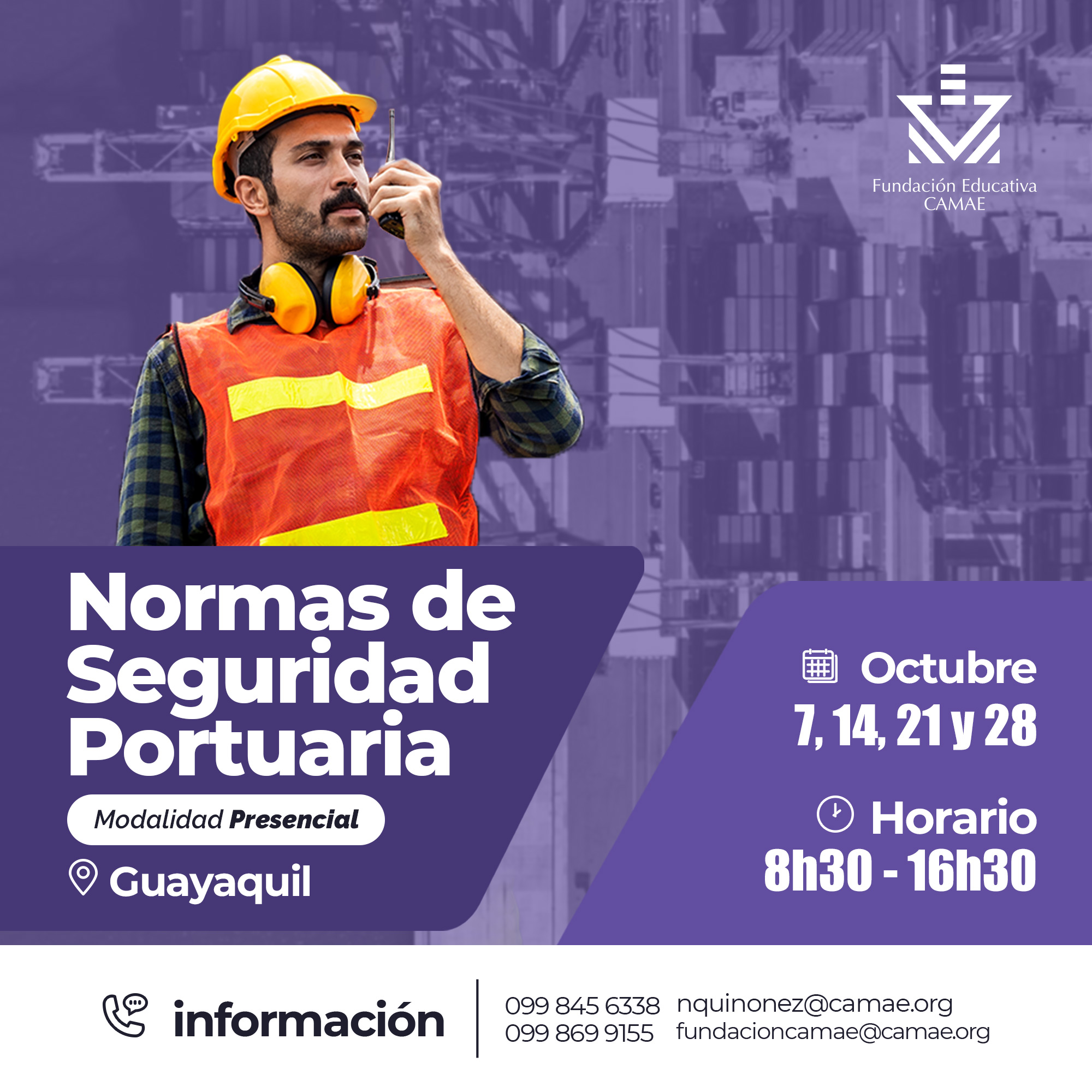 Normas de Seguridad Portuaria PresencialOct072022 Cuándo: viernes 7 de octubre, 2022 a las 08:30 👉Para más información déjanos un mensaje y nos ponemos en contacto✍️WhatsApp: 099 869 9155 – 099 845 6338📧 Correo: fundacioncamae@camae.org – nquinonez@camae.org Compartir