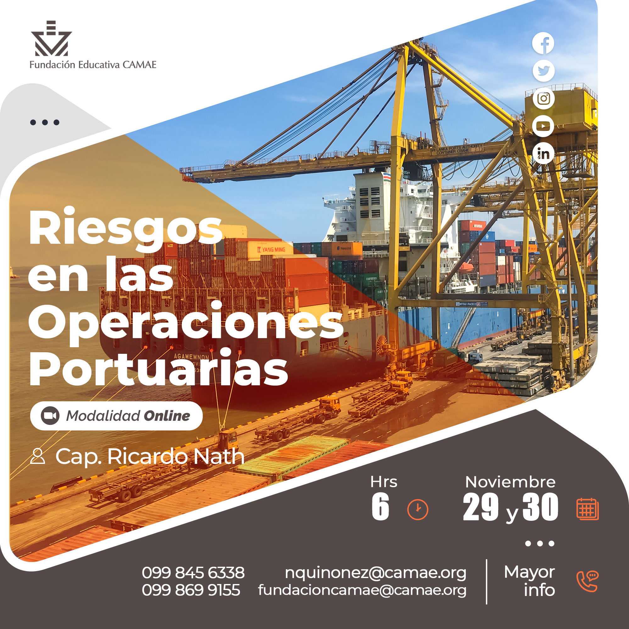 Riesgos en las Operaciones PortuariasNov292022 Cuándo: martes 29 de noviembre, 2022 a las 08:30 👉Para más información déjanos un mensaje y nos ponemos en contacto✍️WhatsApp: 099 869 9155 – 099 845 6338Correo: fundacioncamae@camae.org – nquinonez@camae.org Compartir