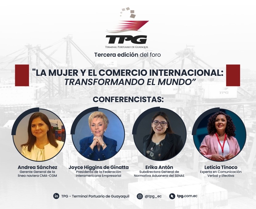 En conmemoración del Día Internacional de la Mujer, por tercer año consecutivo el Terminal Portuario de Guayaquil (TPG) organizará el foro "La Mujer y el Comercio Internacional: Transformando el Mundo". Este evento tiene como objetivo destacar la invaluable contribución de las mujeres como protagonistas esenciales en el ámbito del comercio exterior y su destacado aporte en el mundo de los negocios.