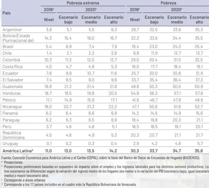 Ante la caída del -5,3% del PIB y el aumento del desempleo de 3,4 puntos porcentuales proyectados por la Cepal, en 2020 la pobreza en América Latina aumentaría al menos 4,4 puntos porcentuales (28,7 millones de personas adicionales) con respecto al año previo, por lo que alcanzaría a un total de 214,7 millones de personas (el 34,7 % de la población de la región). Entre estas personas, la pobreza extrema aumentaría 2,6 puntos porcentuales (15,9 millones de personas adicionales) y llegaría a afectar a un total de 83,4 millones de personas.