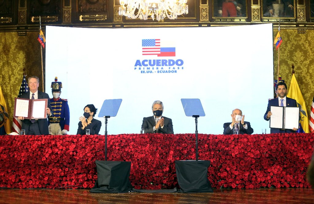 La tarde de este martes funcionarios de estado ecuatoriano y de la nación estadounidense se dieron cita en el Salon Amarillo de Carondelet, para firmar el acuerdo de primera fase que impulsará el comercio entre ambas naciones.