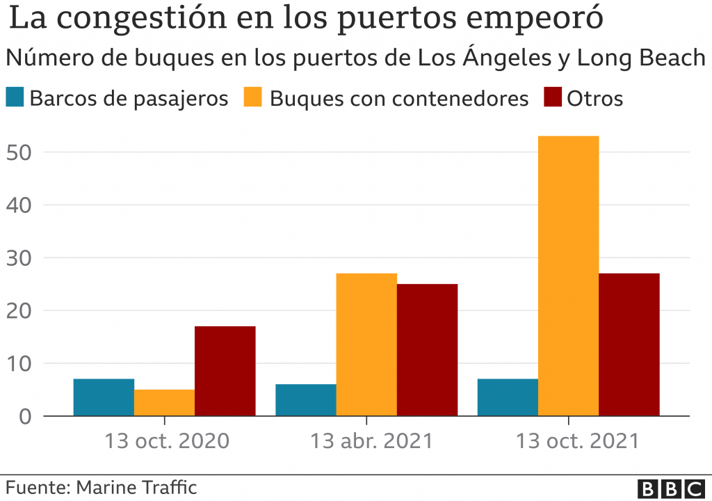Marine Traffic, un sitio web de seguimiento de barcos, contó más de 50 buques frente a Long Beach y Los Ángeles el 13 de octubre, pero en septiembre se alcanzó el récord de 73.