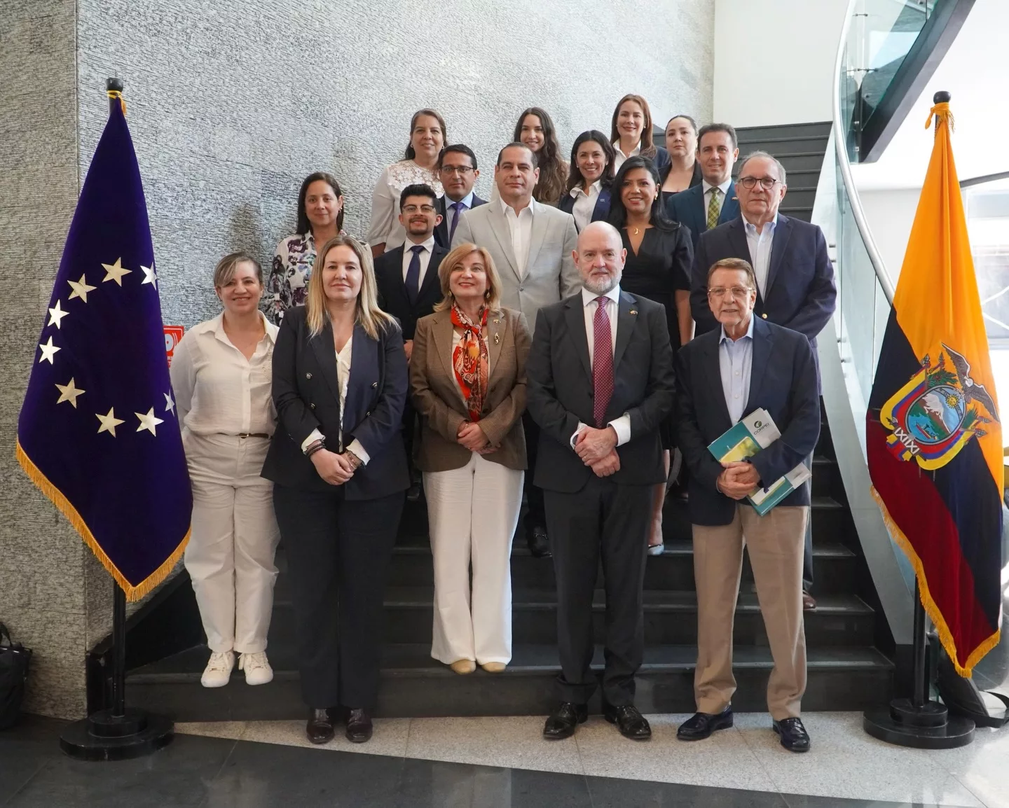 El encuentro contó con la Embajadora de la Unión Europea en Ecuador, Jekaterina Dorodnova y representantes del sector exportador y actores portuarios, abordando desafíos de seguridad y reforzando la cooperación entre Ecuador y Europa para enfrentar riesgos compartidos en la cadena logística.