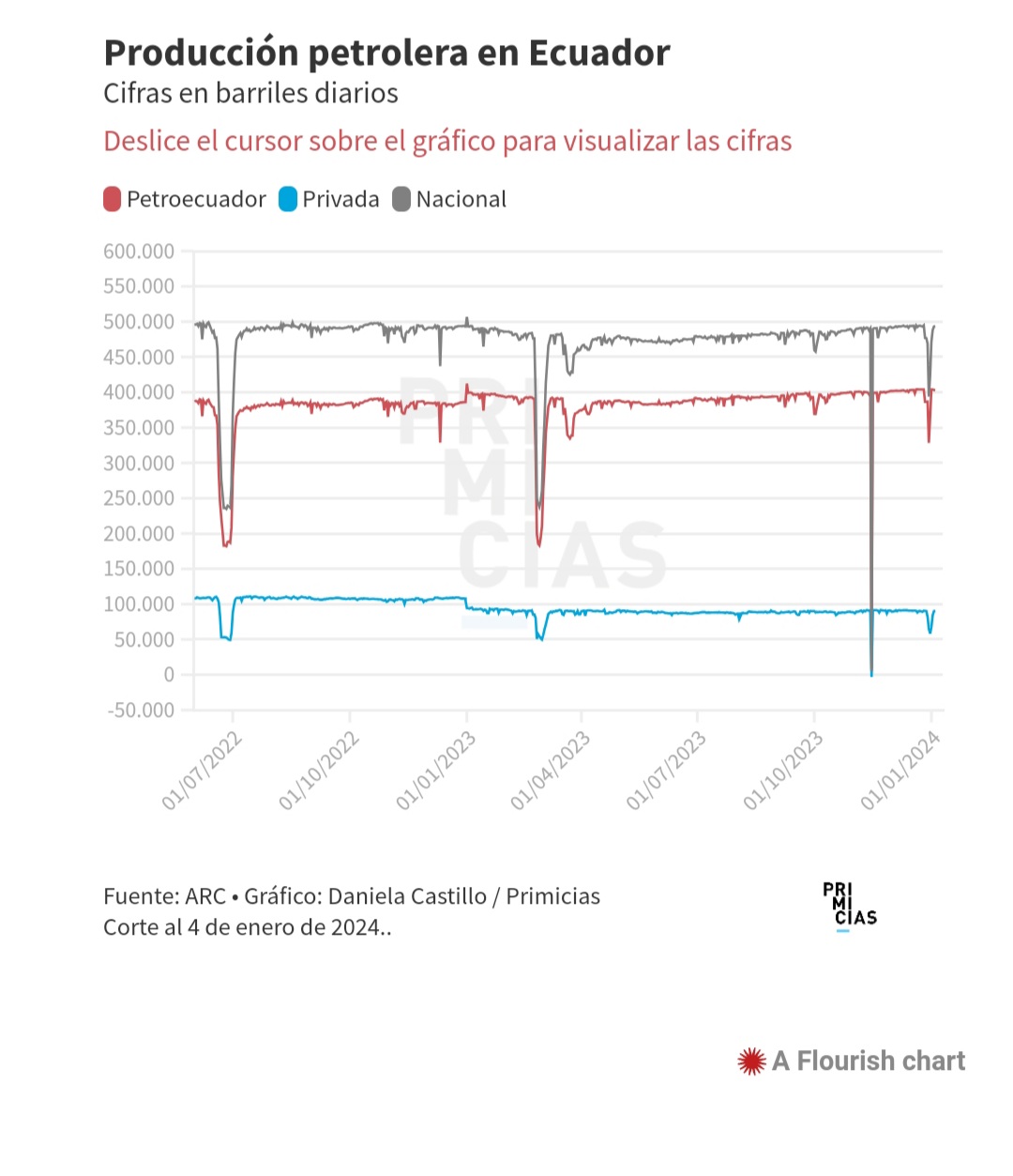 La producción petrolera cerró con una caída de 1,3% en 2023. Mientras que las exportaciones cayeron en valor 24,7% hasta octubre, por la caída de los precios del crudo. El valor del barril de petróleo en Ecuador se ubicó en diciembre en USD 63,2 por barril.