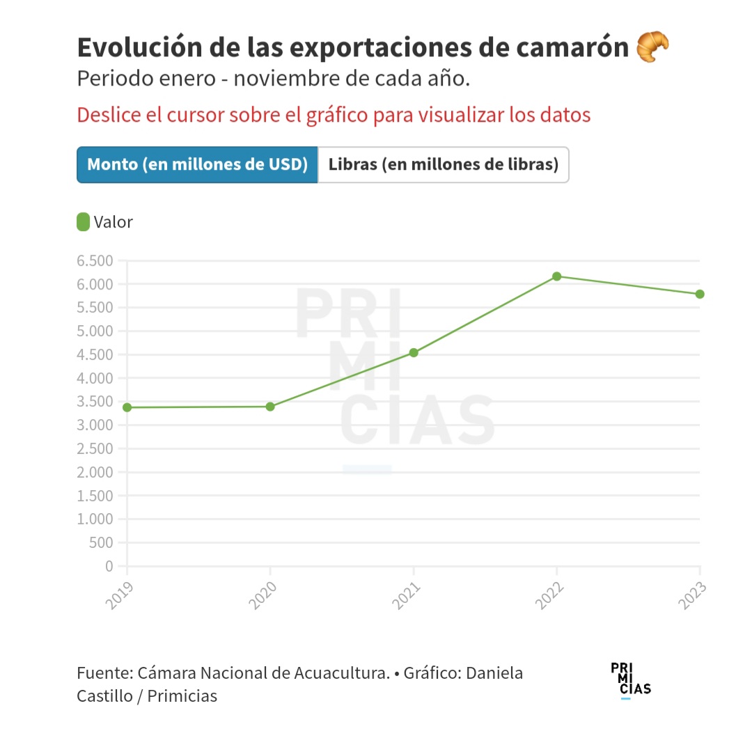 El 2023 fue un año complejo para el sector camaronero, con una caída en sus ingresos de alrededor de USD 1.500 millones, producto de una disminución significativa de los precios internacionales del camarón.