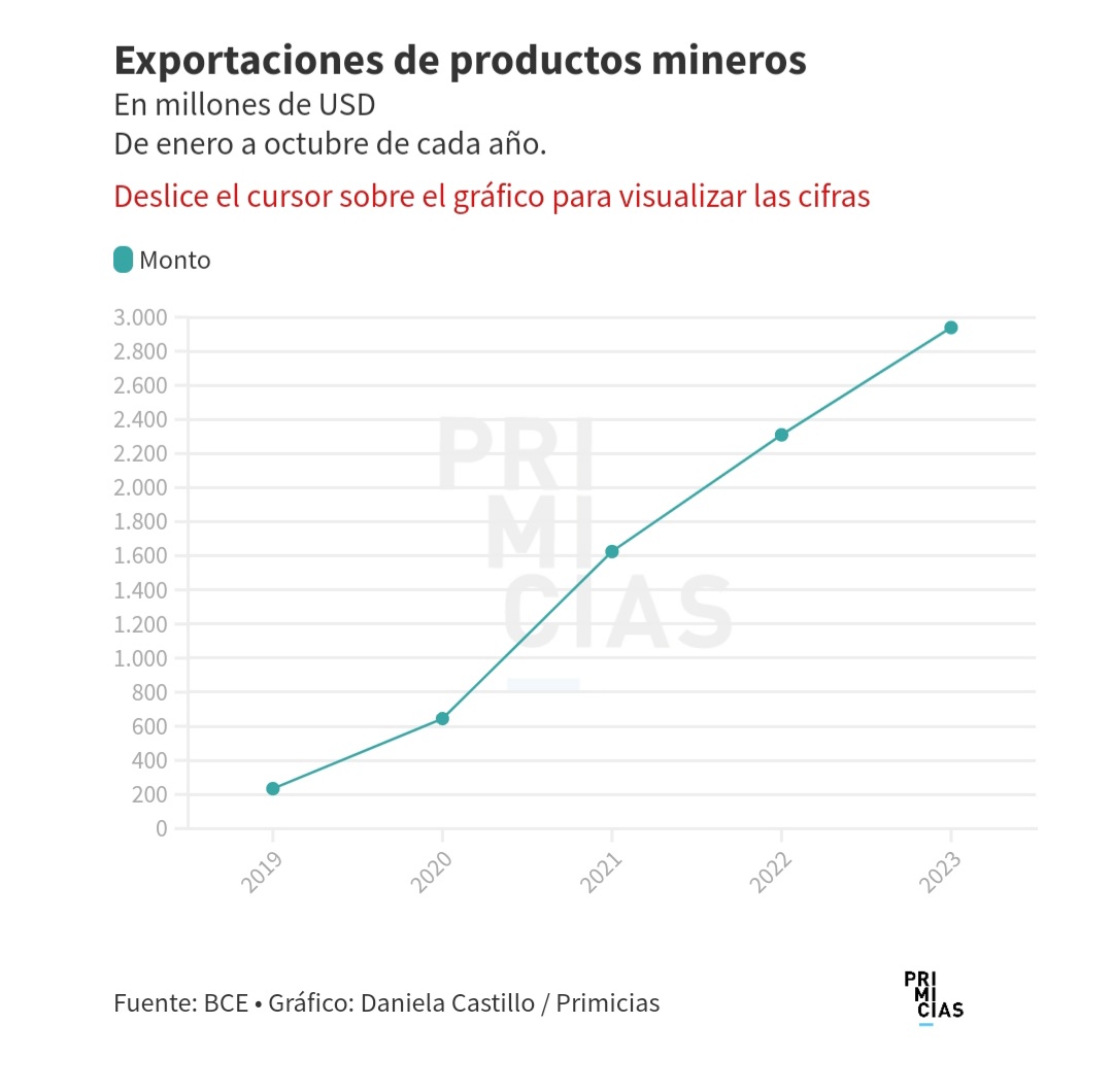 Según el último reporte del BCE, entre enero y octubre de 2023, las exportaciones mineras habían alcanzado un valor de USD 2.938 millones, lo que representó un crecimiento de 27% frente al mismo período de 2022.