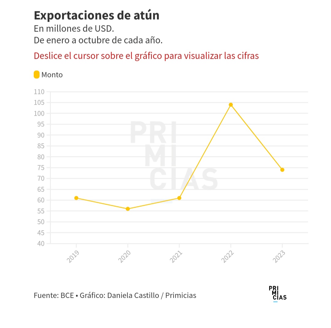 Las conservas de atún y pescado cerraron hasta octubre de 2023 con una caída de 11% en volumen y de 5% en valor, según el BCE. Esta disminución respondió a una menor demanda del atún ecuatoriano por parte del mercado europeo, que debido a la inflación buscaron alternativos con precios más bajos, como los del mercado asiático.
