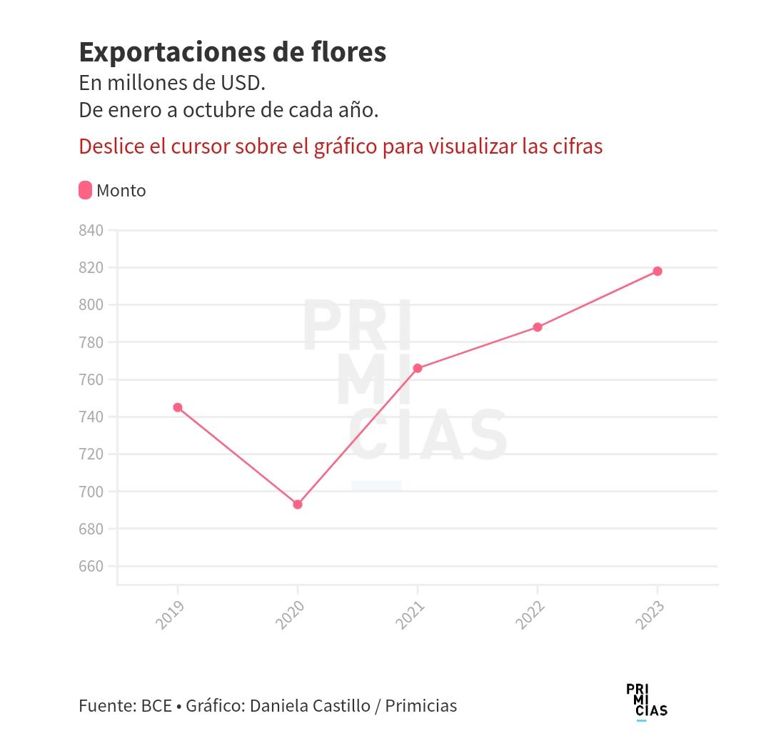 El sector florícola tuvo un crecimiento moderado de 3,8% en valor y de 11,2% en volumen, hasta octubre de 2023. Según las proyecciones del BCE, para 2024, el cultivo de flores podría decrecer 0,3% su valor dentro del PIB. El gremio florícola tiene expectativas de que un posible acuerdo comercial con Canadá impulse las exportaciones de flores hacia ese mercado.