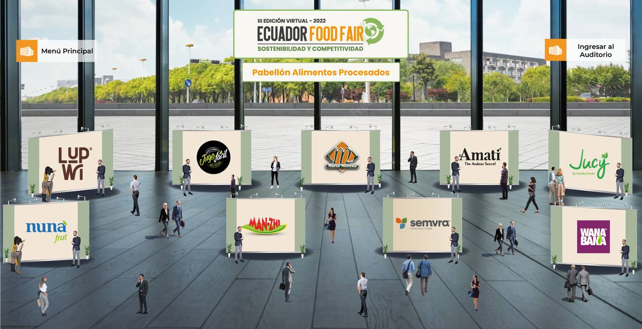 La feria cuenta con ocho pabellones: café y elaborados, elaborados de cacao, frutas no tradicionales, pesca y acuacultura, el pabellón de servicios al exportador y tres pabellones de alimentos procesados. Cada exportador expone su catálogo de productos y cuenta con un chat en línea, que le permite coordinar sesiones B2B con los compradores internacionales.