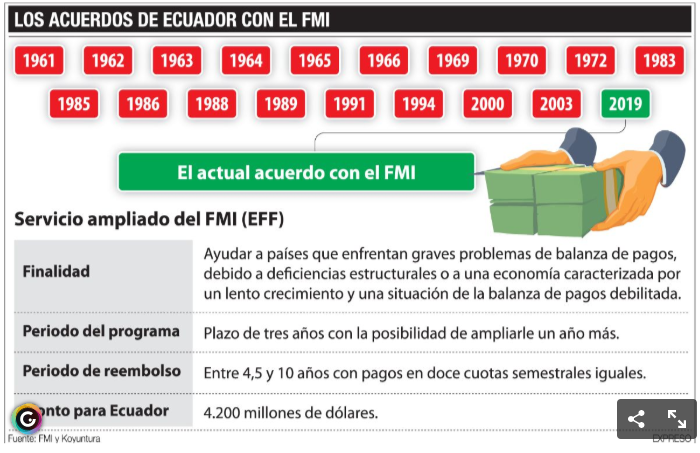 El programa que suscribió Ecuador con el Fondo en febrero de este año tiene como fin último alcanzar un ajuste global, entre menos gastos y más ingresos, equivalente al 5 % del PIB (unos $ 5.400 millones) hasta 2021.