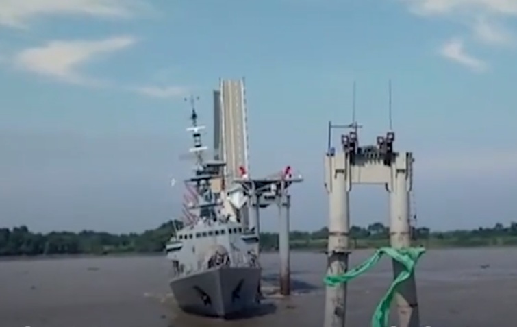En un video difundido en redes sociales se ve que un buque de la Armada aparentemente arrastrado por la corriente se impacta contra dos pilotes metálicos cerca de la parte basculante del puente.