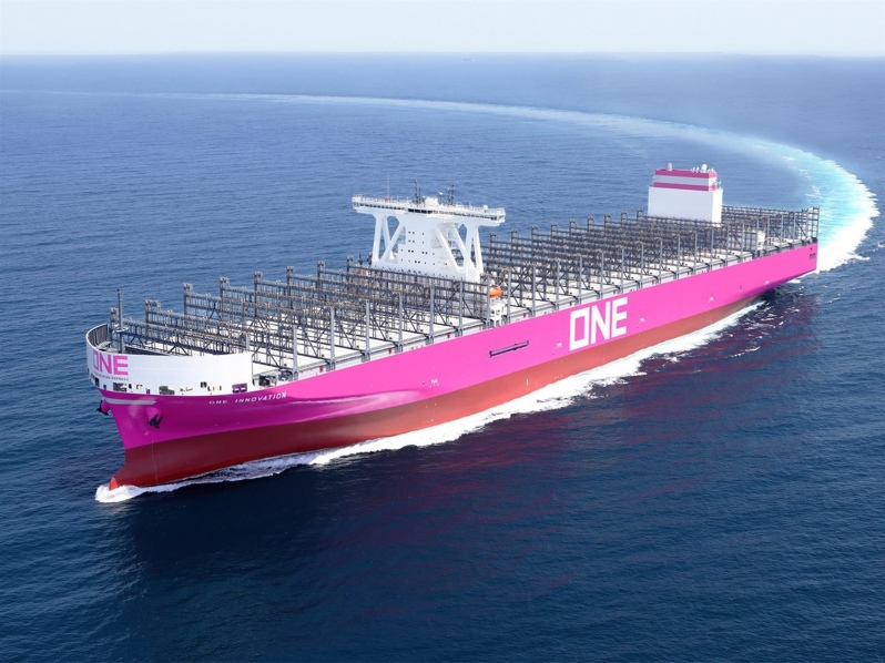 La siguiente innovación Megamax provino del Astillero Nihon de Japón (una empresa conjunta de JMU e Imabari), que descubrió que se podía colocar una bahía de contenedores adicional en el castillo de proa de un buque grande, encima de la cubierta de amarre. Este novedoso concepto se realizó por primera vez en seis gemelos de ONE de 24.136 TEUs, siendo el “ONE Innovation” (en la imagen) el primero de la serie. Cabe destacar que la bahía adicional está protegida por un gran parabrisas que envuelve la proa del buque.