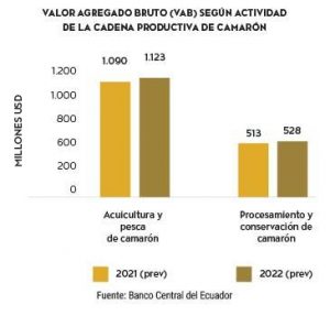 Según el Banco Central del Ecuador (BCE), el Valor Agregado Bruto (VAB) de las actividades primarias de “acuicultura y pesca de camarón” creció de USD 1.090 millones en 2020 a USD 1.123 millones en 2021, alcanzando una participación de 1,6% en el PIB. Asimismo, las actividades industriales encargadas del “procesamiento y conservación de camarón” reflejó al cierre de 2021 un crecimiento anual de 12%, y representan el 0,7% del PIB.