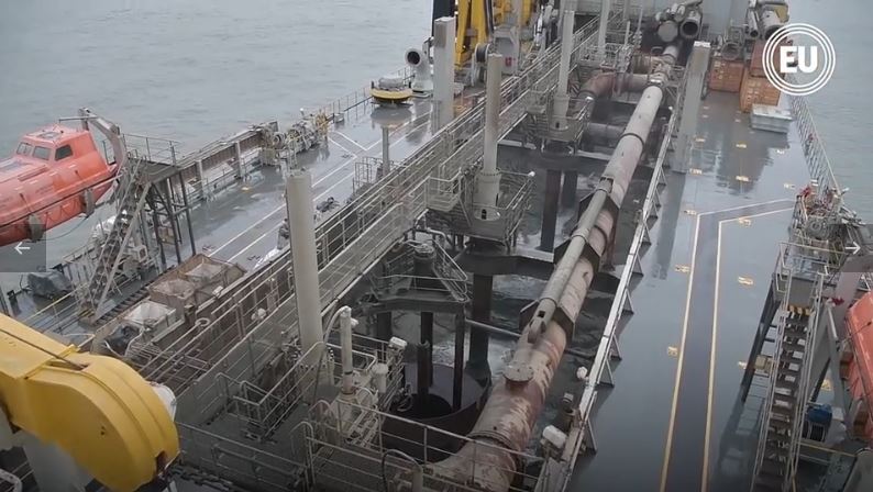 Desde el costado derecho del buque Pedro Álvarez Cabral se abre lentamente un enorme brazo que poco a poco se adentra en el mar. Es como una aspiradora que llega hasta el fondo marino para succionar material y dragar.